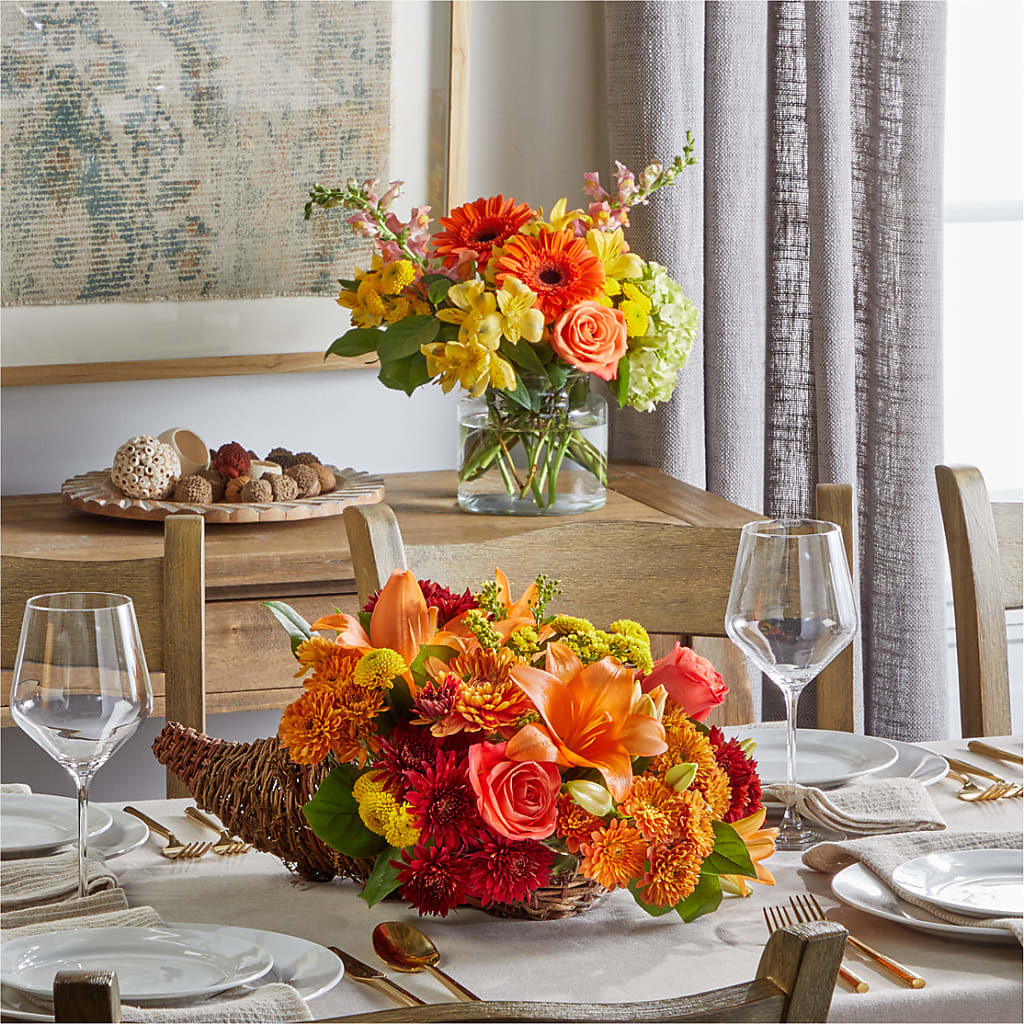 This charming cornucopia and bouquet combo is a colorful reminder to always be grateful.