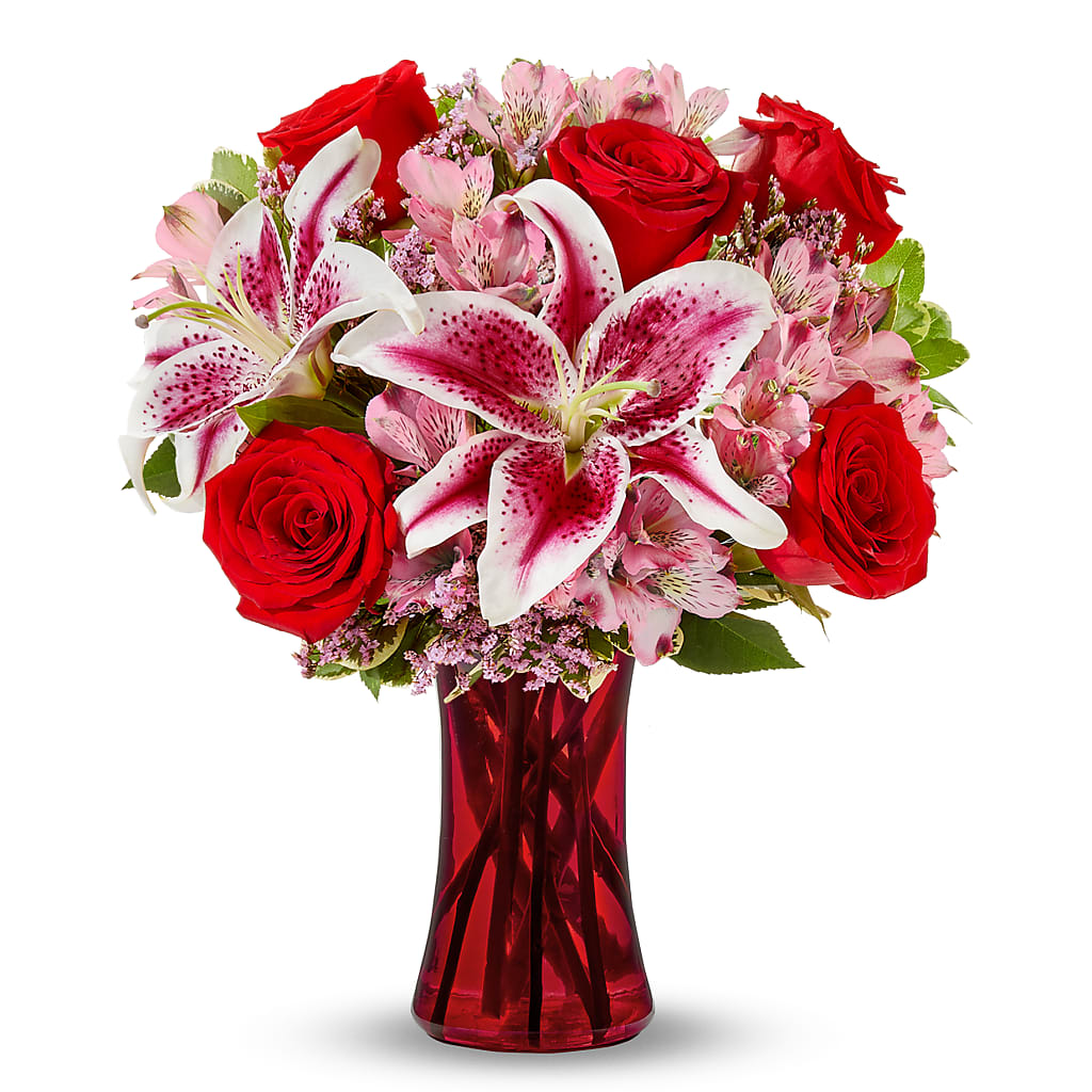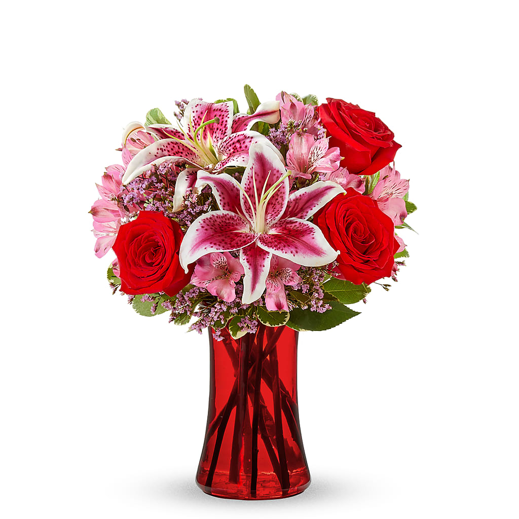 A love eternal, a bouquet that will tell them just that. This Eeternally Bouquet is the perfect gift to tell someone that you have that enduring love. Striking red roses surrounded by stargazer lilies in a beautifully elegant vase. Make their day with this special delivery, perfect for Valentine's Day delivery (or any occasion!).